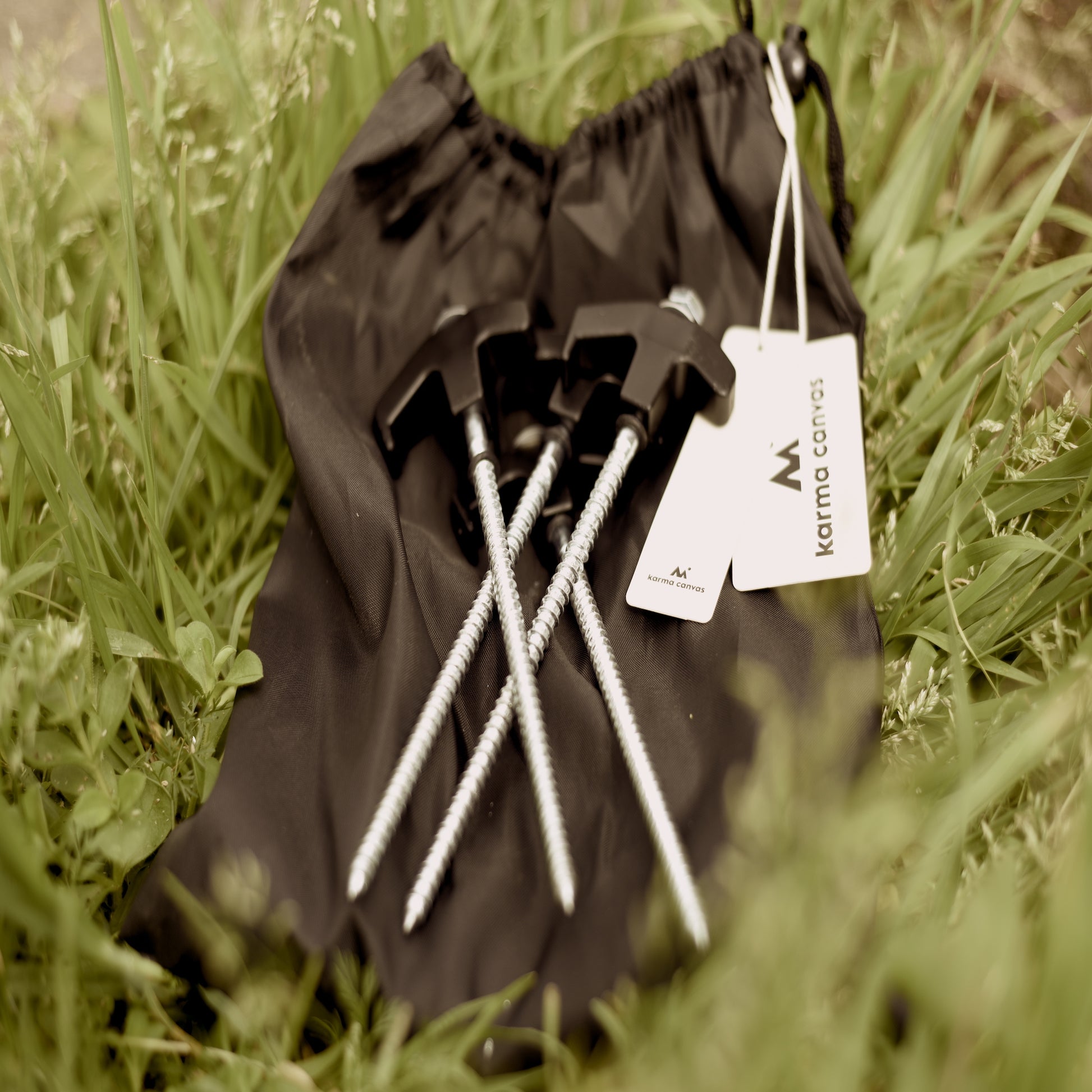 Available for 4m, 5m, and 6m single and double door tents, EarthAnchor works seamlessly with all Karma Canvas tents and is especially ideal when security is paramount. They are primarily designed to be used in place of our groundsheet pegs but can also be used for pegging out guy ropes as well.